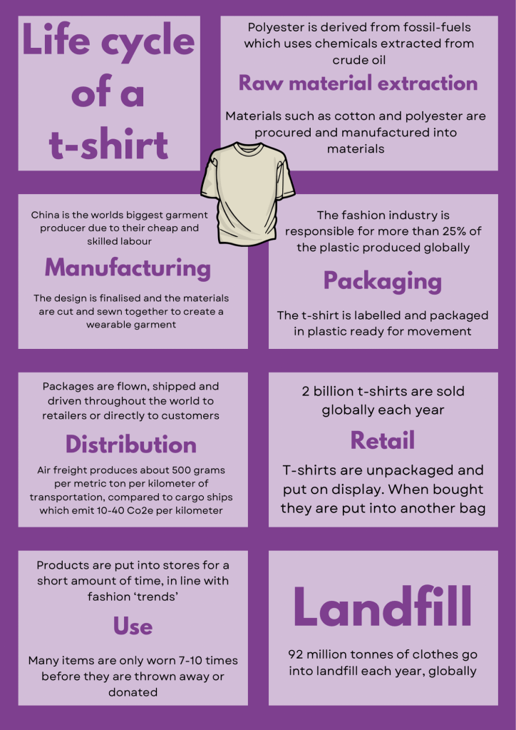 Below is a creative way of sharing the short life-cycle of a t-shirt, along the way are some facts about each stage of production. Look out for another poster on how to make this cycle sustainable and circular!